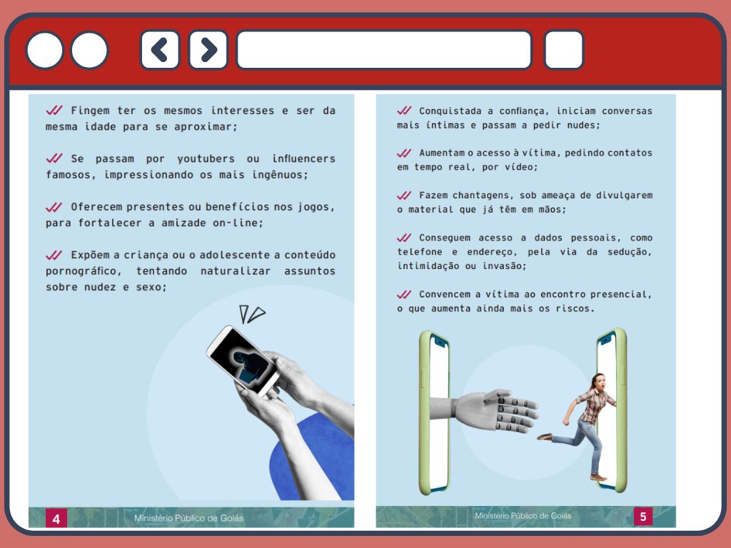 Antes mesmo de o tema conquistar espaço no debate nacional e repercutir no Legislativo, o Ministério Público do Estado de Goiás (MPGO), por meio do Centro Operacional de Atuação na Área da Infância e Juventude (CAO), lançou a cartilha “Violência sexual: como proteger seu filho na internet”. A publicação busca, de forma lúdica, promover a educação em direitos, orientando especialmente pais e responsáveis sobre como identificar sinais de risco e adotar medidas de prevenção ao abuso e à exploração sexual infantil no ambiente virtual. A linguagem foi cuidadosamente elaborada para também dialogar de maneira direta e acessível com adolescentes.