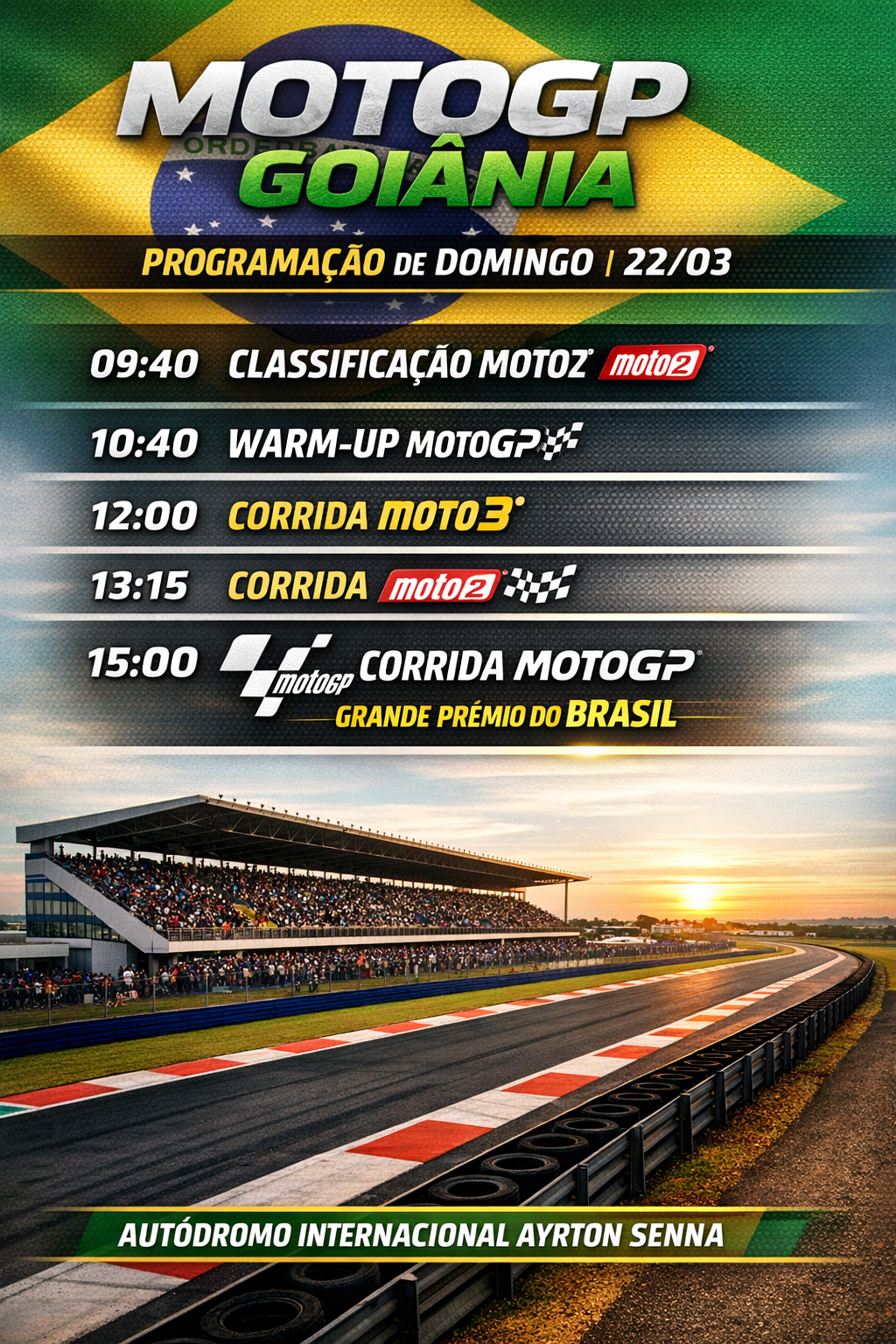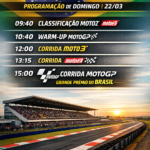 Goiânia – A etapa da MotoGP em Goiânia chega ao seu momento decisivo neste domingo (22/3), com programação oficial definida pela organização e início das atividades ainda pela manhã. O dia começa com a classificação da Moto2, às 9h40, seguida do warm-up da categoria principal às 10h40, culminando nas corridas que encerram o fim de semana histórico no Autódromo Internacional Ayrton Senna.
