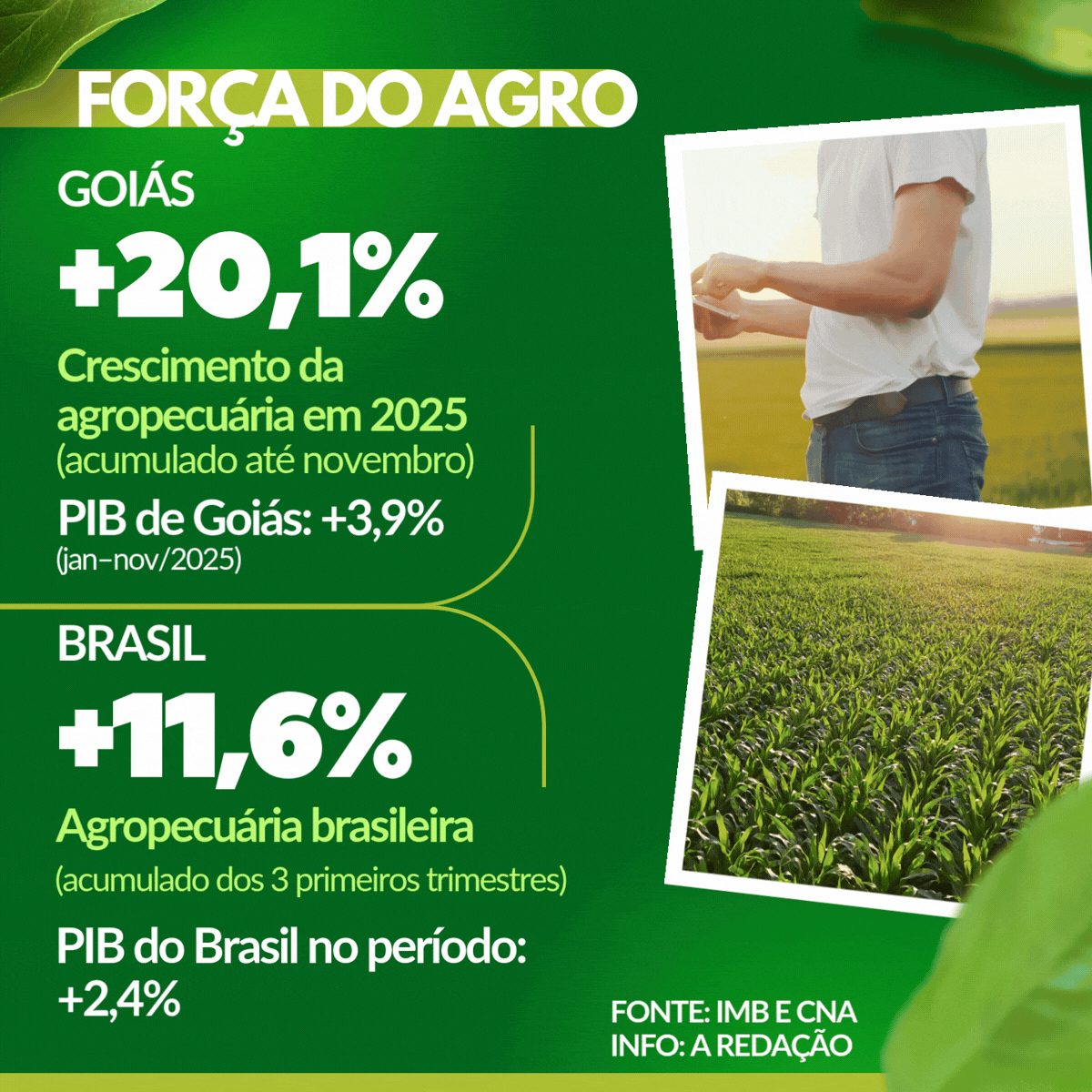 Em Goiás, esse avanço tecnológico encontra um ambiente econômico favorável. A agropecuária foi o principal motor do crescimento da economia goiana em 2025, com alta de 20,1% no acumulado do ano até novembro, segundo dados do Produto Interno Bruto Mensal divulgados pelo Instituto Mauro Borges de Pesquisa e Política Econômica (IMB). O desempenho do setor foi determinante para que o PIB do Estado acumulasse crescimento de 3,9% no período de janeiro a novembro e de 3,7% nos últimos 12 meses, confirmando a força do agro na sustentação da atividade econômica local.