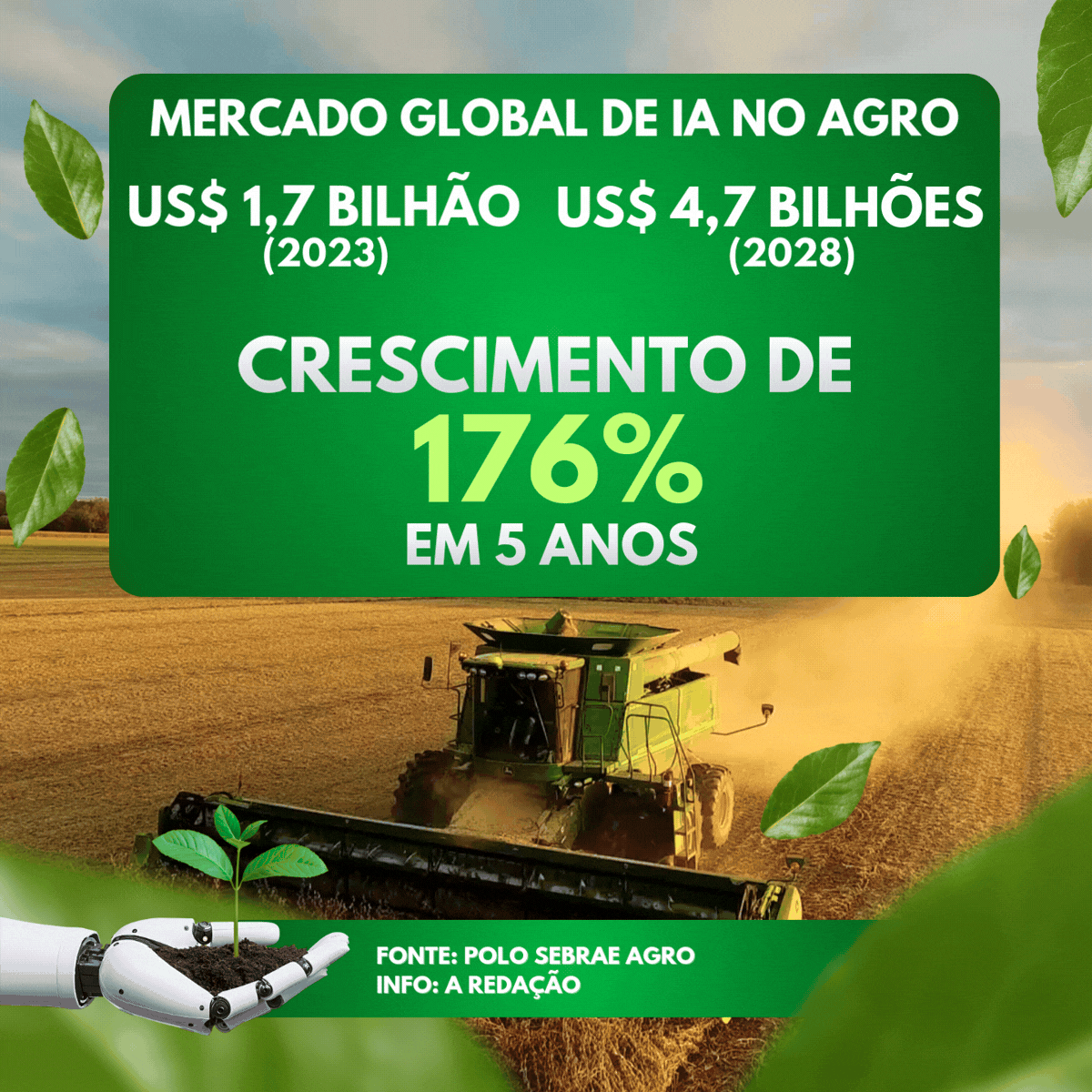 A trajetória da GHydro não ocorre de forma isolada. Ela integra um movimento mais amplo de modernização do agronegócio, marcado pela incorporação acelerada da inteligência artificial como instrumento estratégico para elevar produtividade e ampliar a competitividade do setor. Dados do Polo Sebrae Agro apontam que, entre 2023 e 2028, o mercado global de inteligência artificial aplicada ao agronegócio deve avançar de US$ 1,7 bilhão para US$ 4,7 bilhões, um crescimento de 176% em cinco anos. O avanço reflete a consolidação da tecnologia como aliada direta da eficiência no campo, ao otimizar processos, aumentar a precisão das decisões agrícolas e gerar ganhos simultâneos de sustentabilidade e rentabilidade.