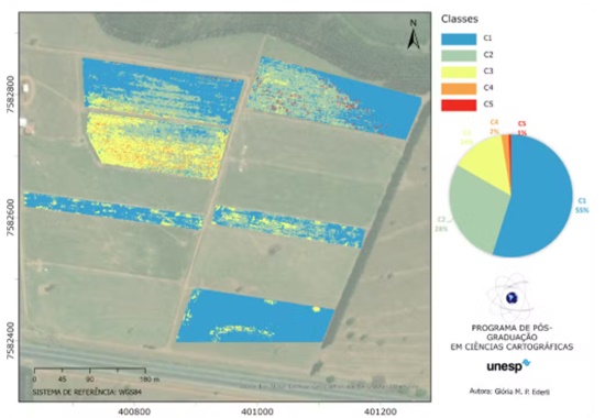 Mapa que indica o nível de infestação por fitonematoides na área de estudo (Foto: Unesp)