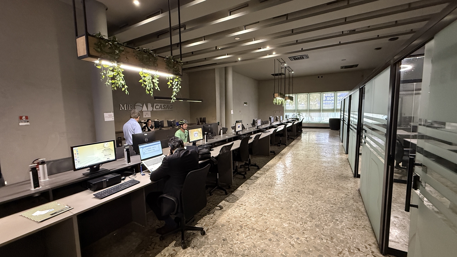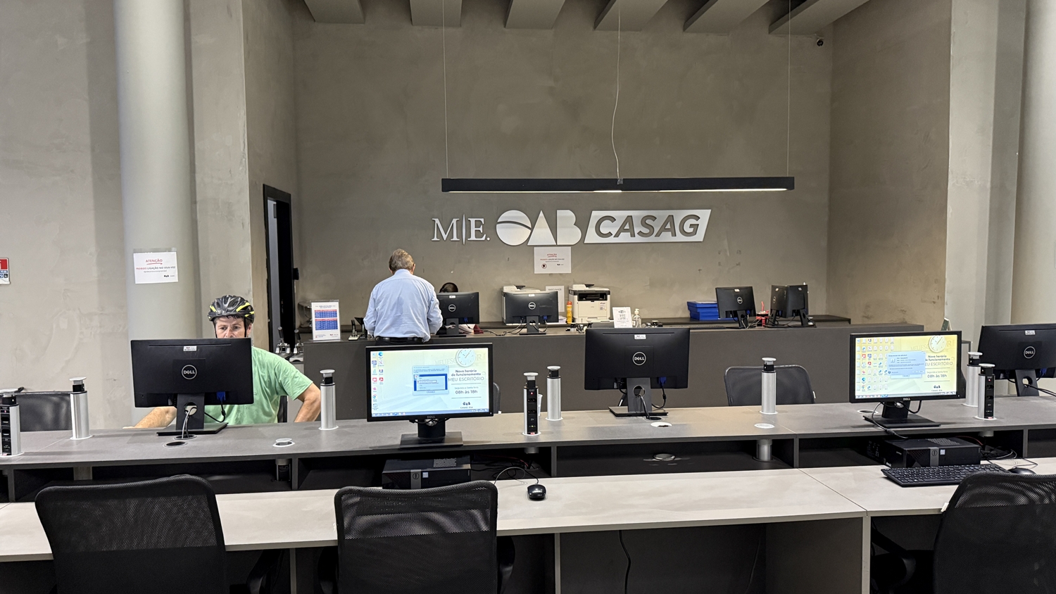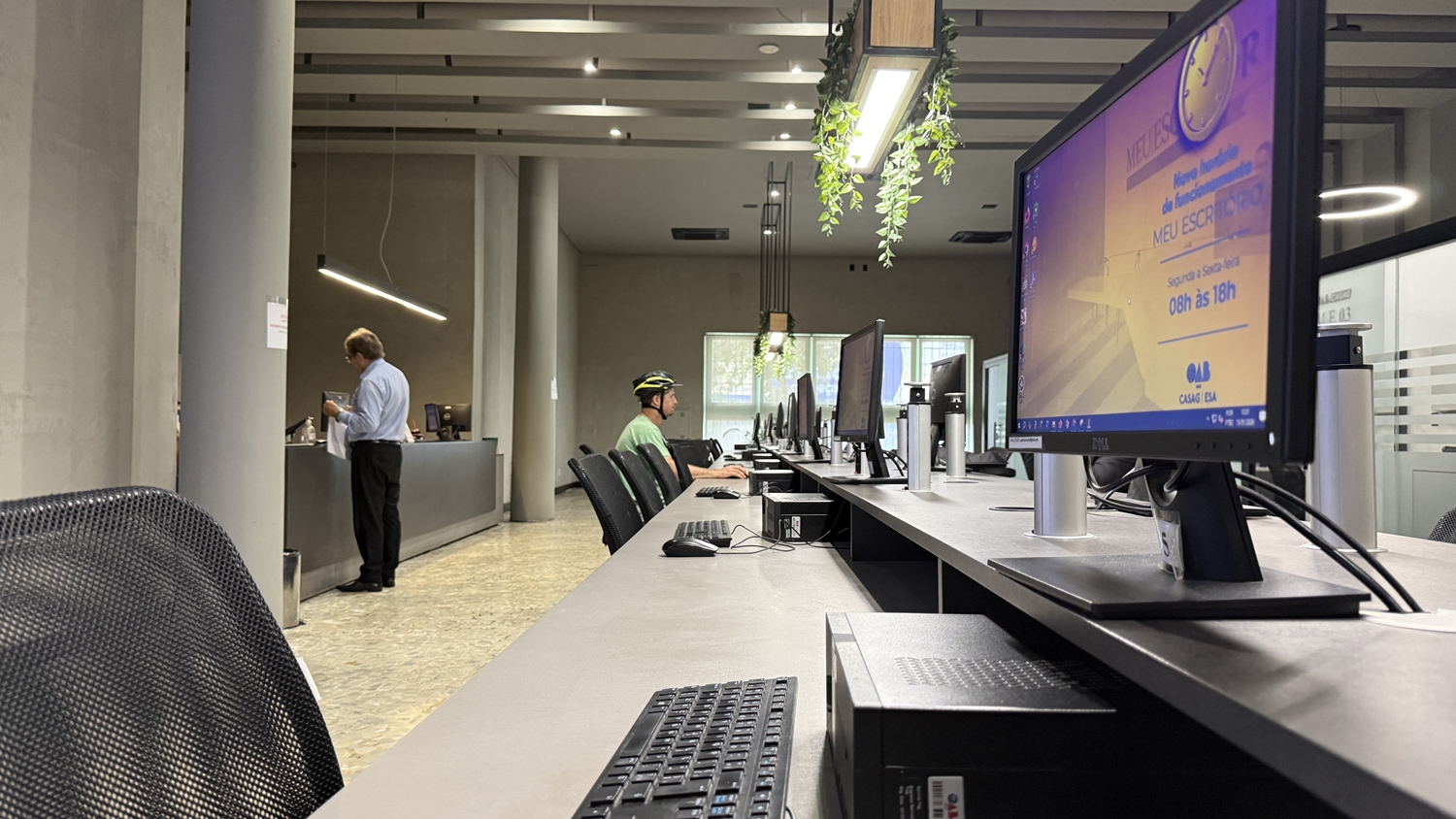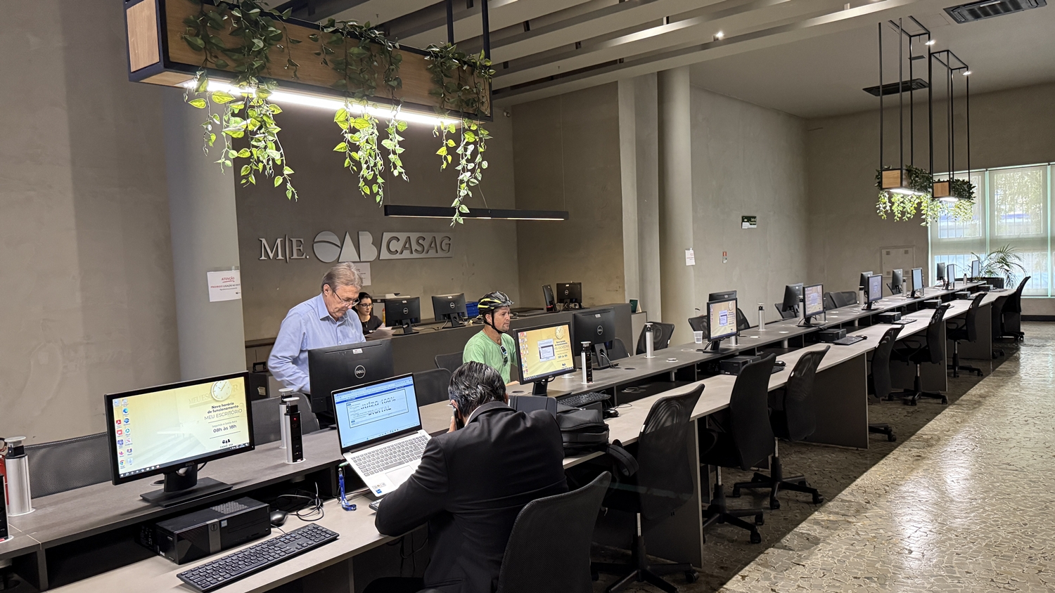 Distribuído em três pavimentos, o espaço foi planejado para atender às diferentes demandas da advocacia. No térreo, o atendimento acontece em baias e estações de trabalho compartilhadas, com computadores, salas individualizadas e equipe preparada para auxiliar no uso de sistemas como Projudi, PJe e PJe-JT. “É um atendimento personalizado para o advogado, com uma equipe que conhece tecnologia da informação e consegue resolver as demandas de forma imediata”, pontua Larissa.