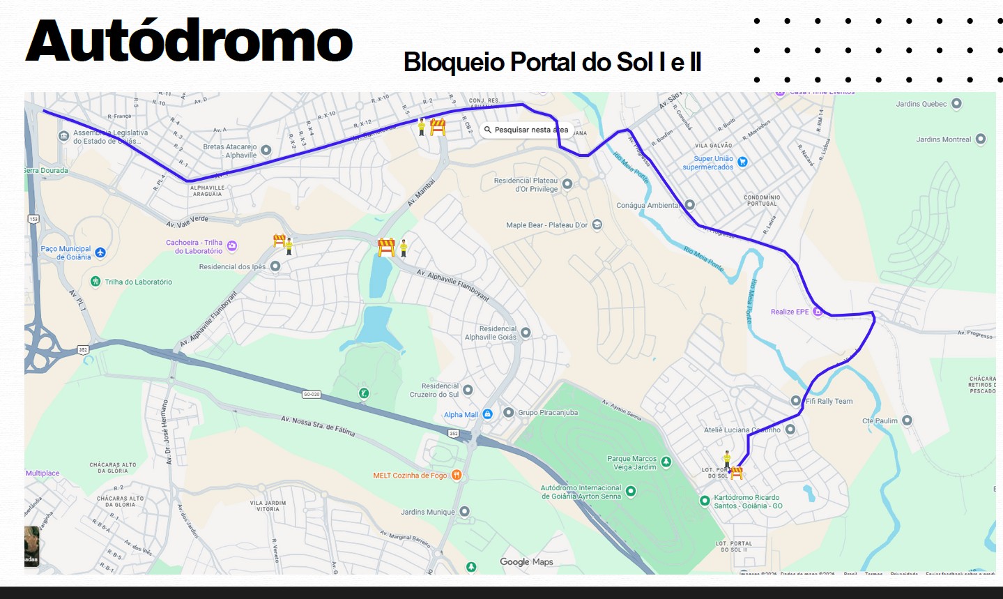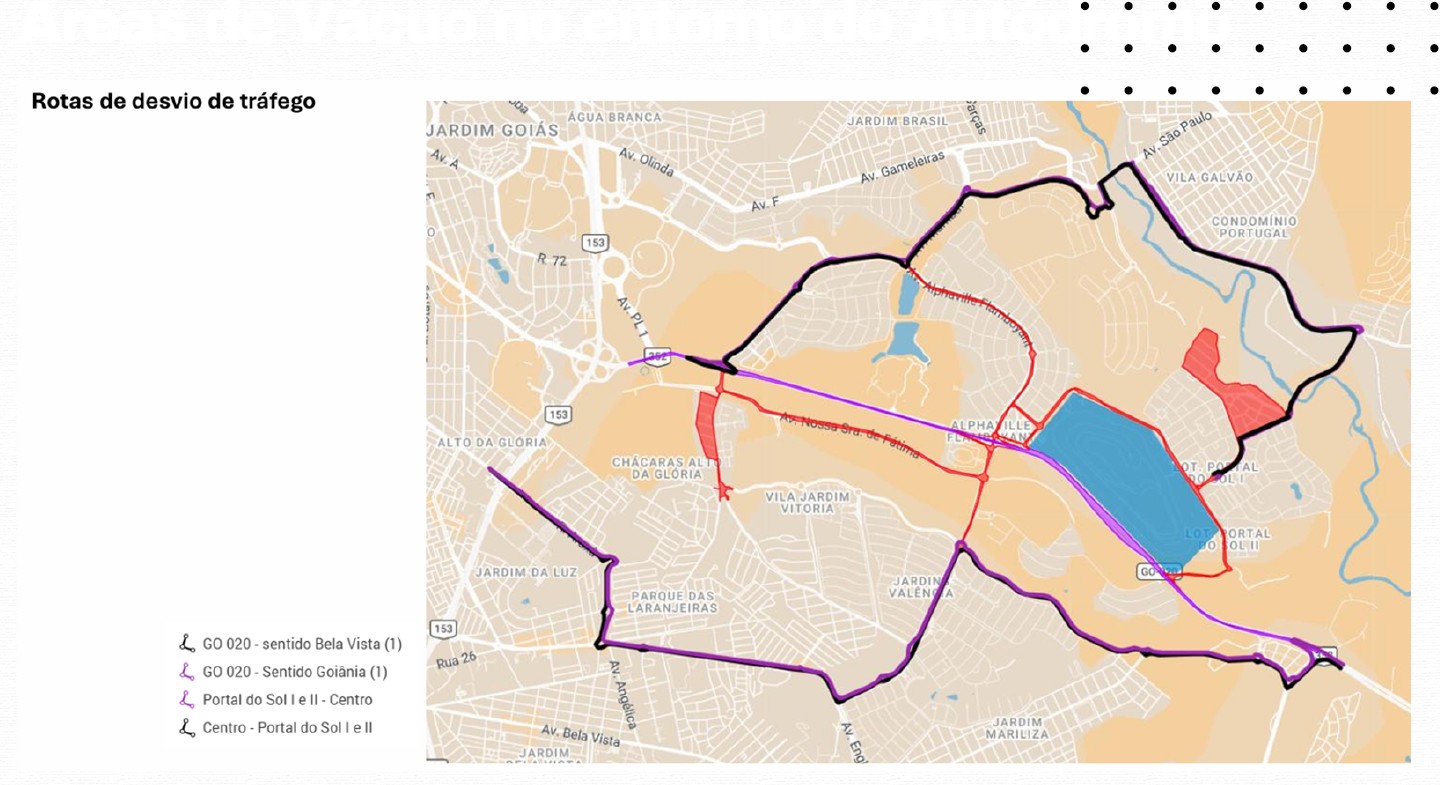 Haverá ponto de controle nas proximidades da região industrial e do trecho próximo à JBS, onde o tráfego será organizado. O motorista que vier de Bela Vista não poderá acessar diretamente a área do autódromo pela GO-020. O fluxo será direcionado para seguir adiante no eixo que conecta com Senador Canedo e, a partir dali, utilizar rotas alternativas previamente sinalizadas.