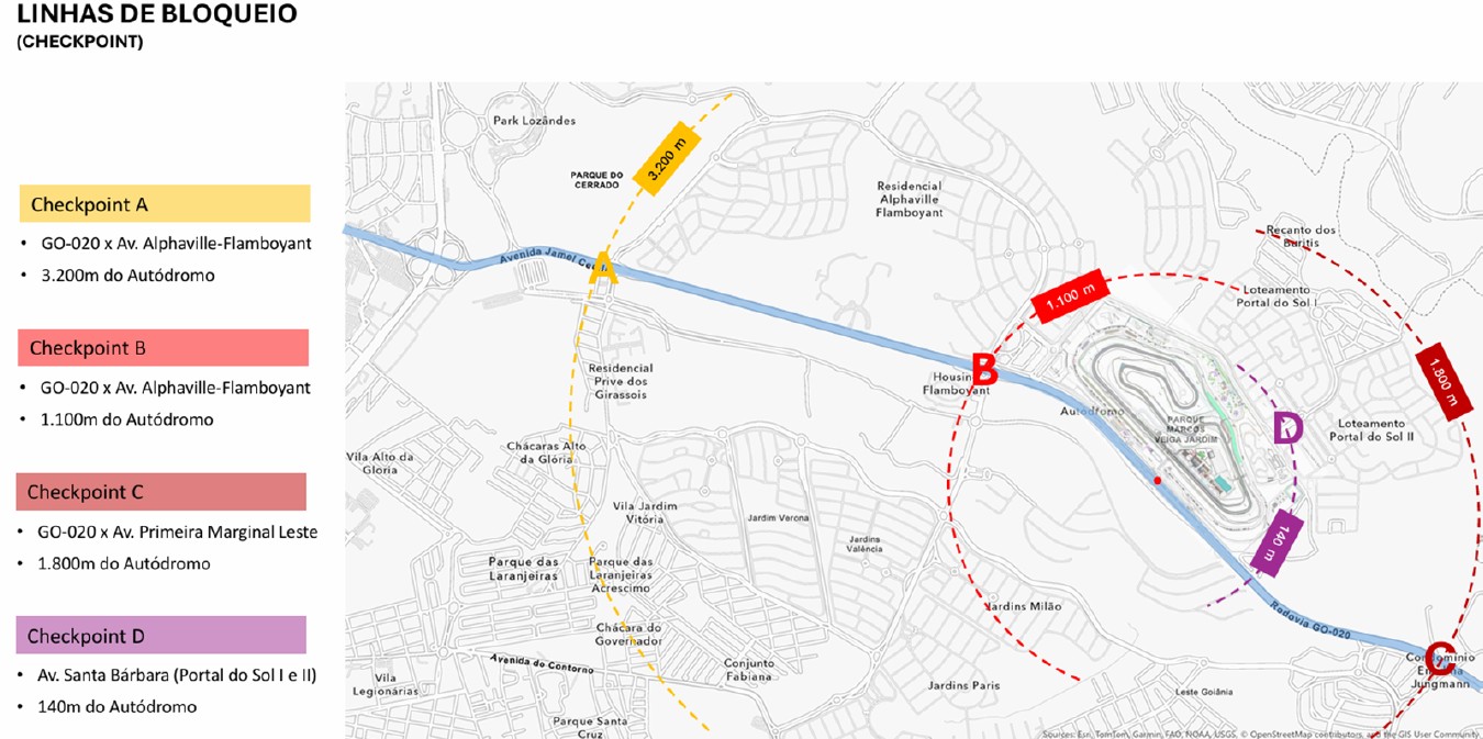 A operação contará com quatro linhas de bloqueio, chamadas de checkpoints, posicionadas em pontos estratégicos da malha viária. Eles funcionarão como filtros progressivos, permitindo apenas a circulação de veículos autorizados conforme a proximidade do circuito. O modelo é organizado por camadas: quanto mais próximo do autódromo, maior a restrição.