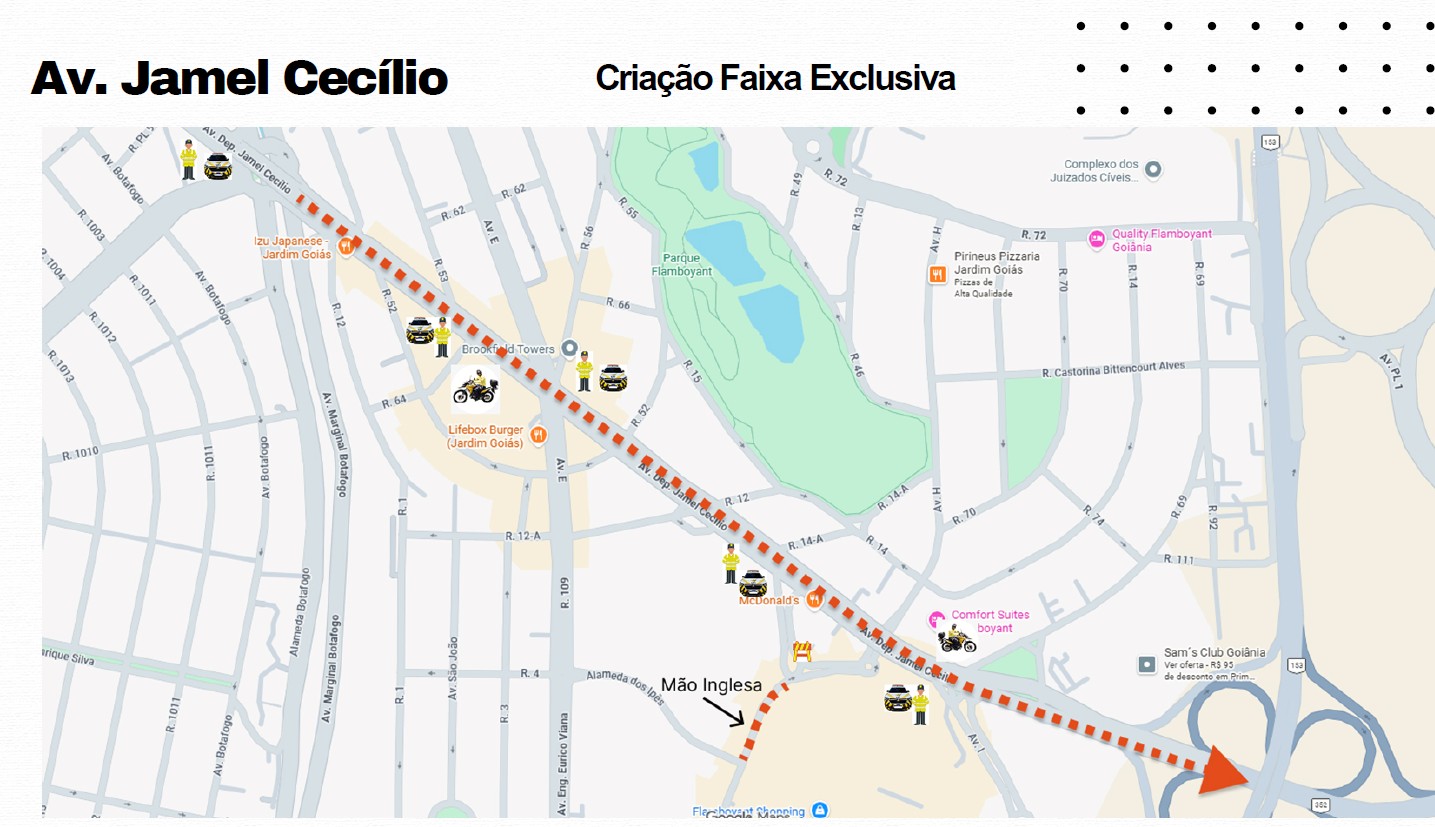 A Jamel Cecílio funciona como corredor estruturante de ligação entre a região dos bolsões — como o Serra Dourada e o Centro Cultural Oscar Niemeyer — e a GO-020, principal acesso ao autódromo. Com a prioridade viária, os ônibus seguirão por trajeto direto até o circuito, reduzindo o tempo de deslocamento e concentrando o fluxo do público no transporte coletivo.