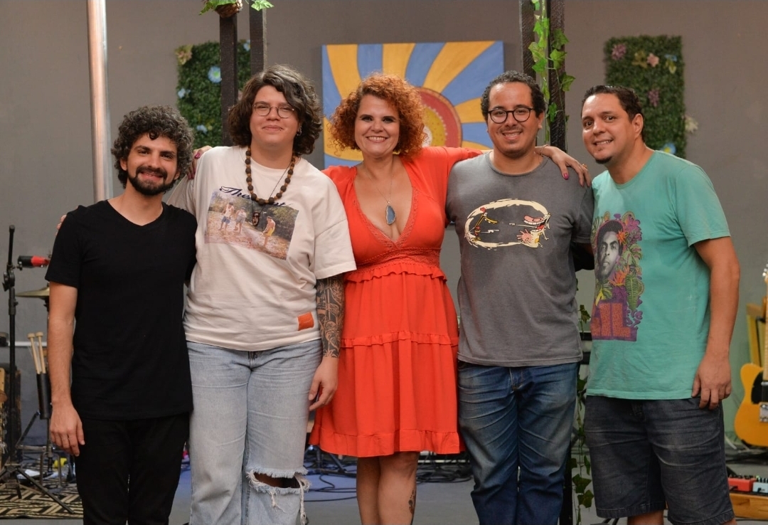 A cantora Rainy Ághata com os músicos Arthur Ornelas, Ingrid Lobo, Leandro Mourão e Rafa Teixeira em apresentação do projeto Reexistir (Foto: Divulgação)